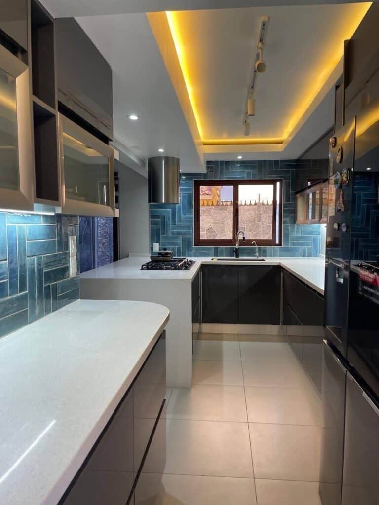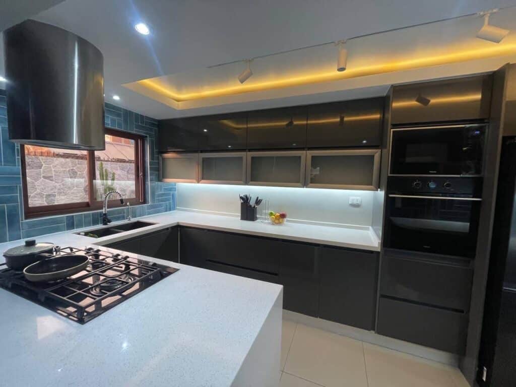 - Cocina melamina azul acero cubierta en cuarzo blanco galaxi